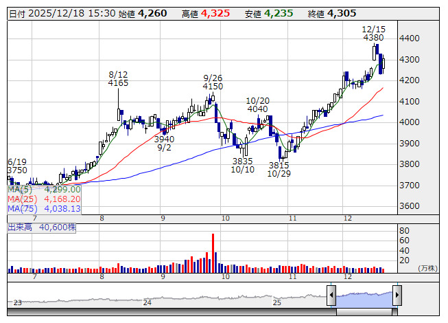 モスフード <日足> 「株探」多機能チャートよりモスフードサービス<8153>が強含み。同社はきょう、New Innovations(東京都江東区)と次世代型店舗開発に向けた人工知能(AI)活用に関するパートナーシップを締結したと発表。これが株価の支えとなったようだ。この取り組みは、AIを活用することで国内約1300店の既存店舗における「ホスピタリティの進化」と「将来の店舗オペレーション高度化」を図るためのもの。New Innovationsとの連携により、複数領域で段階的に研究開発・店舗導入を進めるとしている。