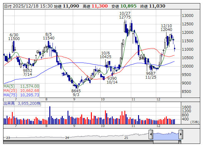 ソフトバンクグループ<9984>が大幅反落、中期波動の分水嶺として意識される26週移動平均線を下放れるかどうかの正念場を迎えており、マーケットの注目度も高まっている。前日の米国株市場では再びハイテク株への売り圧力が再び強まり、ナスダック総合株価指数は400ポイントを超える下げとなったほか、半導体銘柄で構成されるフィラデルフィア半導体株指数(SOX指数)も3.8%安と大きく水準を切り下げた。そのなかオラクル<ORCL>は個別に5%を超える下げとなっており、ソフトバンクGの株価にも影響を与えている。オラクルの株価下落については、同社がオープンAI向けに建設する大規模データセンターに関して連携ファンドが出資を行わないとの報道が嫌気された。AIへの過剰投資懸念が引き続きくすぶるなか、ソフトバンクGも押し目に買い向かう動きは限定的となっている。