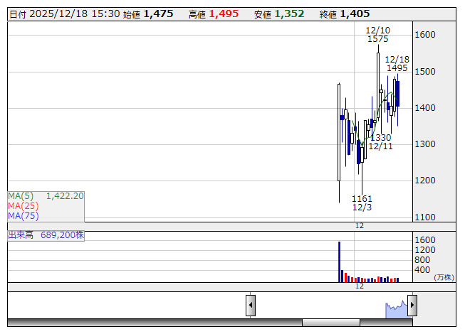 ノースサンド <日足> 「株探」多機能チャートより12月18日の東証グロース市場250指数先物は前営業日比4pt安の634pt。なお、高値は640pt、安値は631pt、日中取引高は4405枚。前日17日の米国市場のダウ平均は続落。連邦準備制度理事会(FRB)のウォラー理事のハト派発言で利下げ期待に買われ、寄り付き後、上昇。その後、オラクル(ORCL)の下落が重荷になり、相場は大きく下落に転じた。終日軟調に推移。終盤にかけて、明日発表の消費者物価指数(CPI)への警戒感に加え、ハイテク中心に売りが一段と加速し下げ幅を拡大し、終了した。本日の東証グロース市場250指数先物は、前営業日比4pt安の634ptからスタートした。米国の株安と長期金利上昇を受け、軟調な始まりとなったものの、その後は方向感の乏しい展開。米アマゾンが、テキサス州西部に建設中のAIデータセンターへの資金提供を取りやめたと伝わったことで、AIバブル崩壊を連想させ、投資家心理が悪化する場面もあった。一方、出遅れ感に着目した押し目買いや短期資金の買い戻しから、昨日安値631pt以下を売る動きもなく、軟調ながらも底堅く推移。小幅反落となる634ptで取引を終了した。東証グロ-ス市場の主力株では、サンバイオ<4592>やノースサンド<446A>などが下落した。