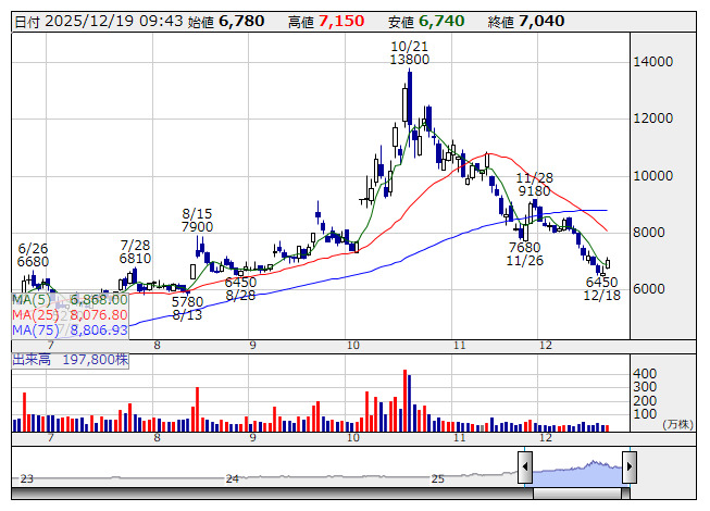 3692>が急動意、一時8.7%高と値を飛ばし7000円台を一気に回復した。前日まで8日連続安と下値模索の動きを続けていたが、足もとでリバウンド局面に移行している。サイバーセキュリティー専業で自社開発の純国産ソフトに傾注するが、安全保障の観点からサイバー防衛の重要性を強く主張する高市早苗政権下で、国策銘柄としての位置付けで株価を大化けさせた経緯がある。ただ、需給主導の急騰で10月21日に1万3800円の年初来高値をつけた後は反動安を余儀なくされていた。ただ、下落局面では外資系証券などによる貸株市場を経由した空売りが急増するなど、需給的な売り圧力が際立っていた。そのショートカバーを誘発する可能性も意識されている。