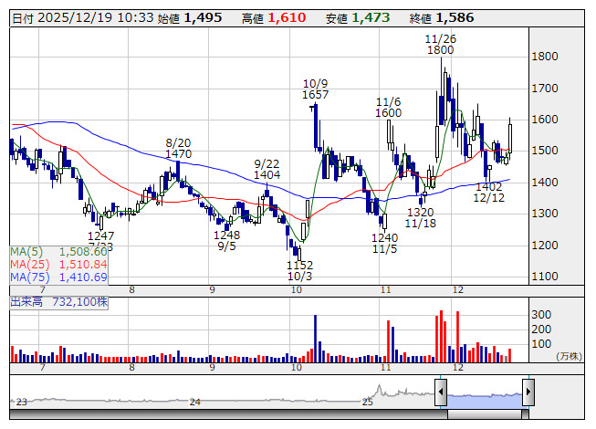 5243>は大幅高。この日午後10時ごろ、経済産業省と新エネルギー・産業技術総合開発機構(NEDO)が実施する生成AI開発を推進するプロジェクト「GENIAC(ジーニアック)」に事業が採択されたと発表した。同事業ではRAG(検索拡張生成)技術を活用し、出版社や学術団体、ウェブメディアなどの持つ高品質なコンテンツを、AIが回答を生成する際に参照できるデータベースを構築するという。これが材料視されている。