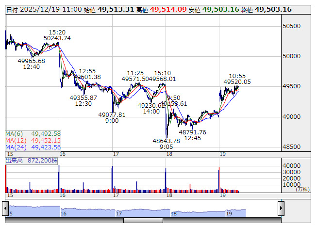 【市況】11時の日経平均は509円高の4万9511円、SBGが185.51円押し上げ