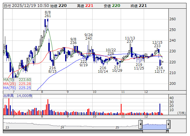 2025年12月19日11時02分 【材料】Jクラフトが続伸、26年6月期第2四半期に投資有価証券売却益を計上へ Jクラフト <日足> 「株探」多機能チャートより ジャパンクラフトホールディングス<7135>が続伸している。18日の取引終了後に、子会社の藤久が保有する投資有価証券の一部を売却するのに伴い、26年6月期第2四半期に投資有価証券売却益約4300万円を特別利益として計上すると発表したことが好材料視されている。なお、26年6月期業績への影響は、他の要因も含めて修正が必要となった場合には速やかに開示するとしている。 出所:MINKABU PRESS