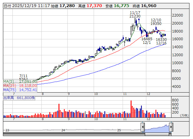 三井金属 <日足> 「株探」多機能チャートより■財務省 : 12月19日受付