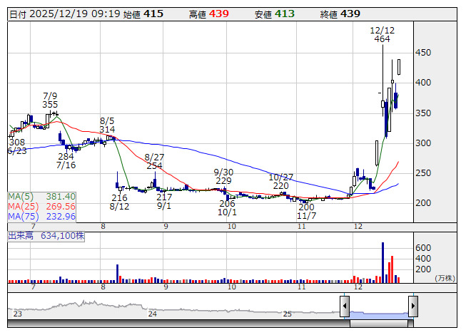 一方、デジタルグリッド<350A>、モルフォ<3653>、ロジザード<4391>、QPSホールディングス<464A>、フィットクルー<469A>など11銘柄が年初来安値を更新。monoAI technology<5240>、アクリート<4395>、PRISM BioLab<206A>、FUNDINNO<462A>、デコルテ・ホールディングス<7372>は値下がり率上位に売られた。