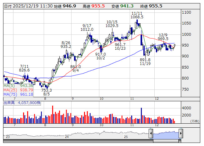 <4755> 楽天グループ 955.5 +16.4 ( +1.8%) 943.4 938.8