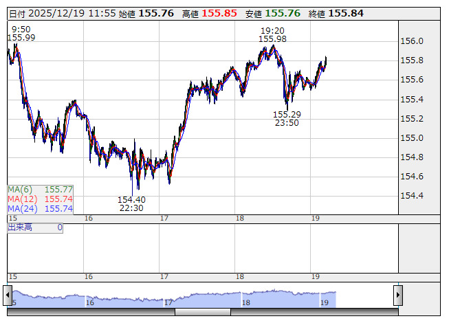 2025年12月19日12時01分 【通貨】外為:1ドル155円83銭前後と小幅なドル安・円高で推移 米ドル/円 <5分足> 「株探」多機能チャートより 19日の外国為替市場のドル円相場は午後0時時点で1ドル=155円83銭前後と、前日午後5時時点に比べ9銭の小幅なドル安・円高。ユーロ円は1ユーロ=182円68銭前後と27銭のユーロ安・円高で推移している。 株探ニュース