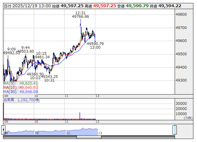 【市況】13時の日経平均は593円高の4万9594円、SBGが201.56円押し上げ