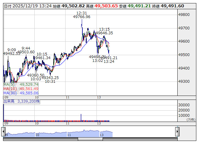 日経平均 <1分足> 「株探」多機能チャートより日経平均 : 49727.54 (+726.04)