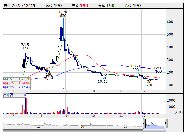 TORICO <日足> 「株探」多機能チャートよりTORICOは前日に1本値でストップ高に買われたが、きょうも商いが成立しないまま値幅制限上限となる50円高は240円でカイ気配に張り付いている。17日取引終了後にShooting Star1号投資事業有限責任組合を割当先とする229万8708株の第三者割当増資(発行価格は143円)を実施することを開示。また、同日に新たに暗号資産投資事業の推進を目的とした100%出資子会社設立を決議したことも併せて発表しており、これを材料に投資マネーが大攻勢をかけている。ただ、マネーゲーム的な要素は否めない。業績面では赤字が続いていることから、一部では慎重なムードも漂う。きょうは「売り予想数上昇」でも5位に入っており、強弱観の対立を物語っている。