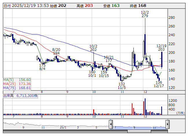 PRISMバ <日足> 「株探」多機能チャートより※出来高変化率ランキングでは、直近5日平均の出来高と配信当日の出来高を比較することで、物色の傾向など市場参加者の関心を知ることができます。