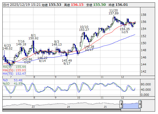 米ドル/円 <日足> Slowストキャス 「株探」多機能チャートより日銀は金融政策決定会合で追加利上げを決め、政策金利である無担保コール翌日物レートの誘導目標を0.25%引き上げて0.75%とした。声明文では今後の金融政策運営について「経済・物価の見通しが実現していくとすれば、経済・物価情勢の改善に応じて、引き続き政策金利を引き上げ、金融緩和の度合いを調整していくことになる」との方針が維持され、目新しい表現がなかったことから相場は円売りで反応。タカ派的なニュアンスはなかったとの見方から、ドル円相場は午後0時20分ごろに156円15銭をつける場面があった。ただ、午後3時30分ごろに行われる植田和男総裁の記者会見を控えて積極的には動きにくく、中立金利について具体的な数値を述べるかどうかに関心が向かっていた。