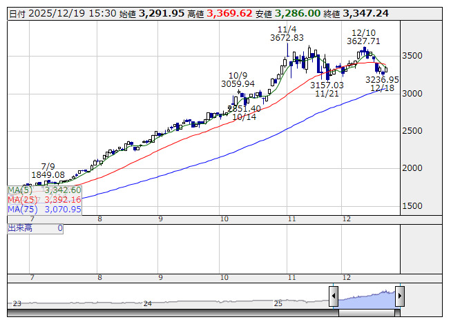 非鉄金属 <日足> 「株探」多機能チャートより●東証33業種 値上がり: 28 業種 値下がり: 5 業種