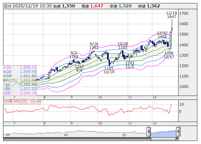 石油資源 <日足> ボリンジャー/カイリ率 「株探」多機能チャートより●株価が+3σを上回った銘柄(市場人気順) ★株価の上げ足が速過ぎ、売りが出やすい銘柄