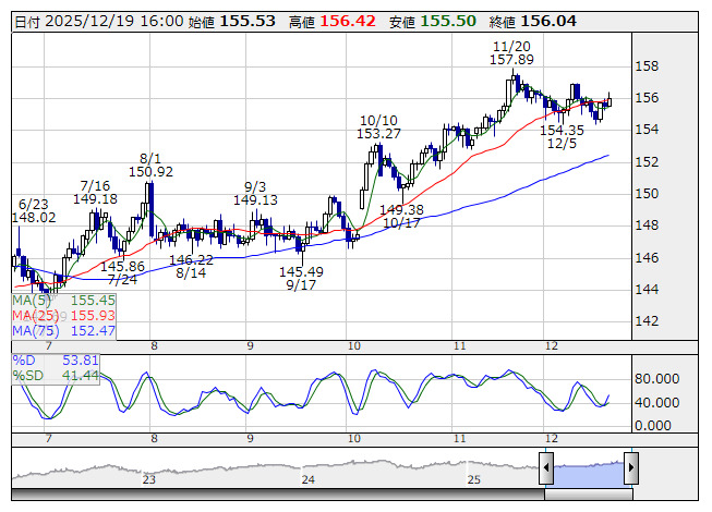 2025年12月19日16時01分 【通貨】外為:1ドル156円01銭前後と小幅なドル高・円安で推移 米ドル/円 <日足> Slowストキャス 「株探」多機能チャートより 19日の外国為替市場のドル円相場は午後4時時点で1ドル=156円01銭前後と、前日午後5時時点に比べ9銭の小幅なドル高・円安。ユーロ円は1ユーロ=182円85銭前後と10銭のユーロ安・円高で推移している。 株探ニュース