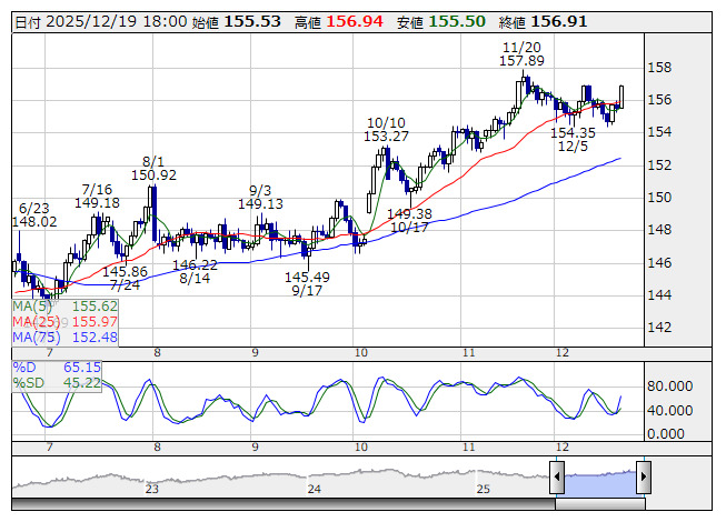 2025年12月19日18時01分 【通貨】外為:1ドル156円93銭前後とドル高・円安で推移 米ドル/円 <日足> Slowストキャス 「株探」多機能チャートより 19日の外国為替市場のドル円相場は午後6時時点で1ドル=156円93銭前後と、午後5時時点に比べ19銭のドル高・円安。ユーロ円は1ユーロ=183円80銭前後と30銭のユーロ高・円安で推移している。 株探ニュース