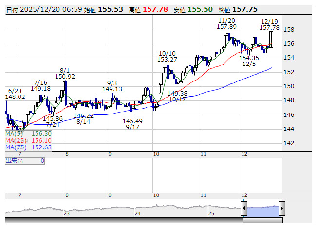 12月18-19日開催の金融政策決定会合で0.25ptの追加利上げが全会一致で決定されたが、中立的な金利水準は明示されなかったこと、日本銀行植田総裁の会見では利上げぺースの加速を示唆する発言は特になかったことから、金融政策決定会合終了後にリスク選好的な米ドル買い・円売りが次第に強まり、欧米市場で157円台後半まで円安ドル高が進行した。