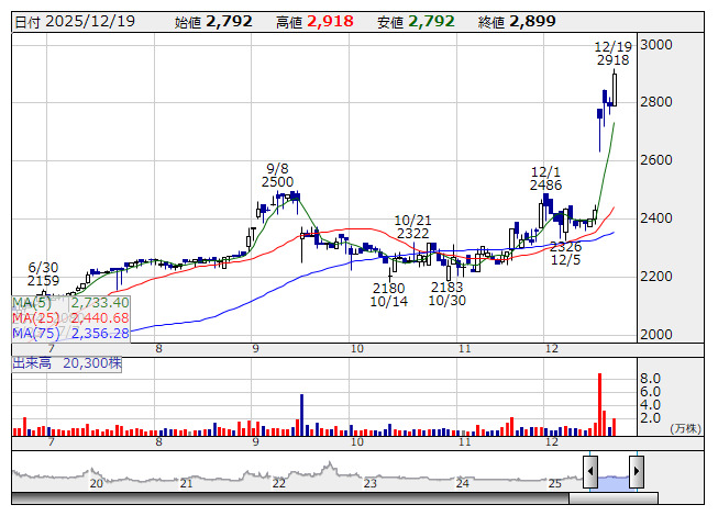 2025年12月20日17時00分 【注目】今週の【株式分割】銘柄 (12月15日~19日 発表分) Fインタ <日足> 「株探」多機能チャートより ―――――――――――――――――――12月15日 (月) 発表分―― ●Fインタ <7050> [東証G] 26年1月31日現在の株主を対象に1→2の株式分割を実施。最低投資金額は現在の2分の1に低下する。 ―――――――――――――――――――12月19日 (金) 発表分―― ●ノリタケ <5331> [東証P] 26年3月31日現在の株主を対象に1→2の株式分割を実施。最低投資金額は現在の2分の1に低下する。 株探ニュース