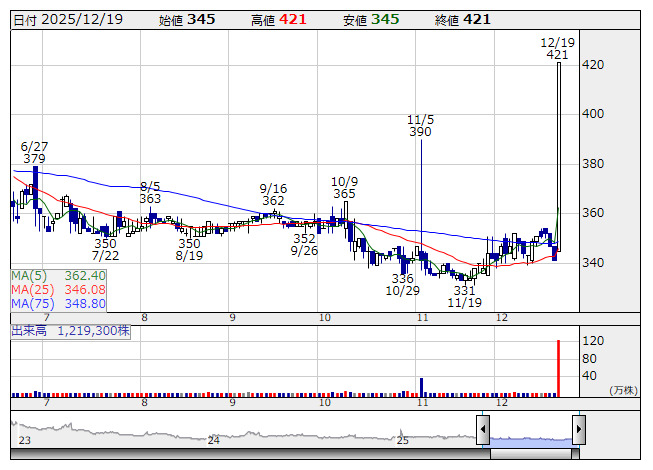 ワンダープラネット <4199> [東証G]が3日続急伸。同社は10月3日にブシロード <7803> [東証G]とともに、共同開発の新作モバイルゲーム「HUNTER×HUNTER NEN×SURVIVOR(ネンサバ)」の発表を行い、2026年の世界同時配信に向け開発を進める方針を明らかにしていたが、12月18日夜にネンサバの公式Xを通じ、同月19日の日付とともに、重大発表を続々公開する予定だと告知された。英語の公式Xでも同様の告知があった。更にApp Storeではネンサバについて、2026年2月18日リリース予定だとの表示がある。これらが刺激材料となり、短期資金の流入を誘発したとみられている。