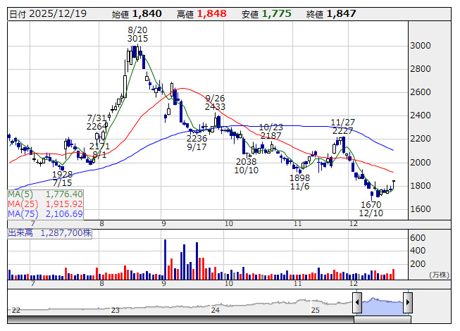 アドバンテスト <6857> [東証P]が反発。前日18日の米国株市場ではハイテク株を中心に切り返す展開となり、ナスダック総合株価指数が300ポイントを超える上昇で反発したほか、ここ下値模索の続いていたフィラデルフィア半導体株指数(SOX指数)が6日ぶりに2.5%高と大きく切り返した。前日18日に好決算を発表した半導体メモリー大手マイクロン・テクノロジー <MU> が一時17%高と急騰し、これがAI・半導体関連株全般の買い戻しに火をつけた形となっていた。東京市場でもこの流れを引き継いで、 半導体セクターへのショートカバーや押し目買いを誘発していた。