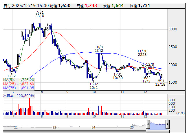 2025年12月22日05時50分 【注目】本日注視すべき【増資・売り出し】銘柄 (19日大引け後 発表分) レナ <日足> 「株探」多機能チャートより ○レナ <4889> [東証G] CVI Investmentsを割当先とする26万3400株の第三者割当増資を実施する。発行価格は1562円。 ○ユトリ <5892> [東証G] アカツキ <3932> など3先を割当先とする44万2700株の第三者割当増資を実施する。発行価格は2258円。 [2025年12月22日] 株探ニュース