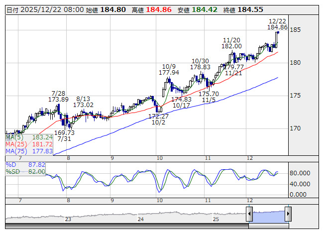 ユーロ/円 <日足> Slowストキャス 「株探」多機能チャートよりユーロ・ドルは、1.0341ドル(2017/01/03)まで下落したが、1.2537ドル(2018/02/18)まで上昇。その後、0.9536(2022/09/28)まで反落したが、2024年にかけて1.1ドル台まで戻している。ユーロ・円は英国民投票で欧州連合(EU)からの離脱が決定し、一時109円57銭(2016/06/24)まで急落。その後137円50銭(2018/2/2)まで買われたあと、長期間伸び悩んだが、日欧金利差の拡大や円安・ドル高の進行、日本銀行による12月利上げの可能性は大幅に低下したことから184円75銭(2025/12/19)まで一段高となった。欧州中央銀行(ECB)は2026年のインフレ見通しを引き上げたこと、日本の財政悪化が懸念されているため、リスク回避的なユーロ売り・円買いがただちに拡大する可能性は低いとみられる。