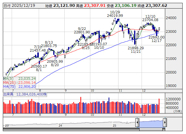 NASDAQ <日足> 「株探」多機能チャートより本日の東証グロース市場250指数先物は、続伸となりそうだ。先週末のダウ平均は183.04ドル高の48134.89ドル、ナスダックは301.26pt高の23307.62ptで取引を終了した。追加利下げを期待した買いが続き、寄り付き後、上昇。ハイテクの上昇が支援したほか、新年度相場に向けた資金流入も報告され、相場は続伸した。終盤にかけ、株価指数先物や個別取引、それぞれのオプション取引の期限にあたるクアドルプル・ウィッチング・デー絡み、さらに、指数入れ替えなどテクニカルな動きで伸び悩んだものの、終日堅調に推移し、終了。上昇した米株市場と同様、本日の東証グロース市場250指数先物は、続伸となりそうだ。米株高に加え、日銀の追加利上げが材料として消化されたことで、堅調な始まりが予想される。日足チャートでは、5日移動平均線や一目均衡表の転換線を上回ったほか、約1カ月ぶりにパラボリックが陽転しており、反転機運は強まっている。ボリンジャーバンドのプラス2シグマ(661.5pt)を上限、ミドルライン(646.4pt)を下限とした相場をイメージしたい。なお、夜間取引の東証グロース市場250指数先物は前営業日日中終値比6pt高の652ptで終えている。上値のメドは665pt、下値のメドは645ptとする。.