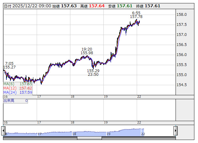 2025年12月22日09時01分 【通貨】外為:1ドル157円63銭前後と大幅なドル高・円安で推移 米ドル/円 <5分足> 「株探」多機能チャートより 22日の外国為替市場のドル円相場は午前9時時点で1ドル=157円63銭前後と、前週末午後5時時点に比べ89銭の大幅なドル高・円安。ユーロ円は1ユーロ=184円58銭前後と1円08銭の大幅なユーロ高・円安で推移している。 株探ニュース