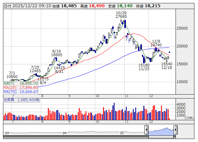SBG <日足> 「株探」多機能チャートより前週末の米国株市場ではエヌビディア<NVDA>やマイクロン・テクノロジー<MU>、アドバンスト・マイクロ・デバイシズ<AMD>など半導体関連の中核銘柄が軒並み大幅高に買われており、ナスダック総合株価指数やフィラデルフィア半導体株指数(SOX指数)も大きく水準を切り上げる展開となった。ここまでAI関連や半導体関連は過剰投資への懸念が機関投資家のポジション調整の売りを誘っていたが、下値を見込んだショート筋の売りも観測され、その買い戻しが株価押し上げに反映された面もある。東京市場でもこの流れに追随する形で、日経平均寄与度の高いソフトバンクGやアドテストなどの戻り足を後押ししている。