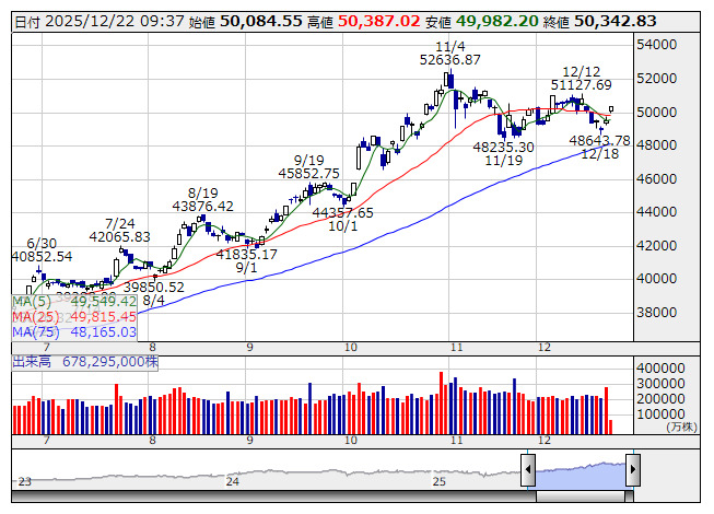 日経平均 <日足> 「株探」多機能チャートより前週末の米国株市場でAI関連や半導体関連が大きく買い戻されたことを受け、東京市場はこの流れを引き継ぎハイテク系の値がさ株に買いが向かい、日経平均は一時800円を超える上昇をみせる場面があった。これに連動して日経レバは、理論通り日経平均の約2倍の上昇率を示すなど高パフォーマンスをみせている。また、日経レバの株式需給関係に目を向けると、直近12月第2週末現在で、信用買い残の整理が進捗する一方、売り残が増加しており、信用倍率が1.04倍と完全に拮抗した状態となっている。ここからの強気筋と弱気筋の攻防に注目が高まる。