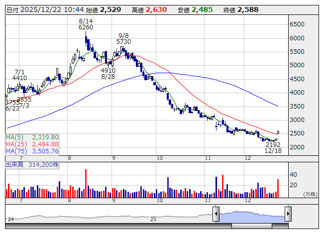 ユトリ <日足> 「株探」多機能チャートより<5892> yutori 2592 +313