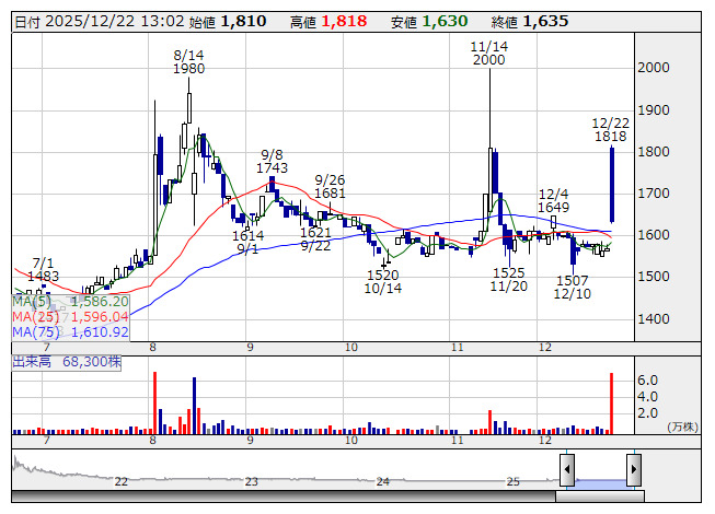 大幅高。前週末大引け後、25年12月期の業績予想の上方修正を発表した。今期の売上高予想は従来計画1,861百万円から1,930百万円(前期比26.3%増)、営業利益は従来計画85百万円から209百万円(同4.2倍)に引き上げた。主力であるメディア事業においてPV数が堅調に推移したことに加え、編集体制の質の向上及び効率化によって、収益性が当初想定を上回って推移したようだ。また、当期において検討していたM&Aについて、取締役会において今期内の実施予定がないことを確認したことを考慮した。