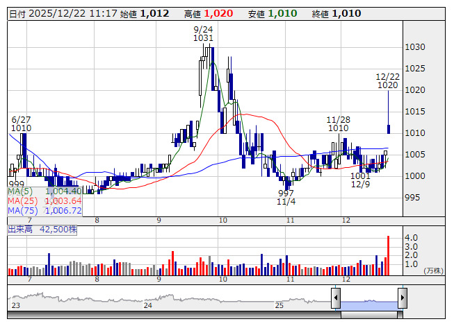 2025年12月22日11時21分 【材料】ライドオンEが続伸、投資事業組合運用益発生で26年3月期最終利益予想を上方修正 ライドオンE <日足> 「株探」多機能チャートより ライドオンエクスプレスホールディングス<6082>が続伸している。前週末19日の取引終了後、26年3月期の連結業績予想について、最終利益を4億3200万円から7億2400万円(前期比2.2倍)へ上方修正したことが好感されている。 子会社ライドオン・エースタート1号投資事業有限責任組合で投資事業組合運用益4億8100万円が発生する見込みであることなどが要因としている。なお、売上高233億7700万円(同0.1%減)、営業利益8億1000万円(同3.7%増)は従来見通しを据え置いている。 出所:MINKABU PRESS