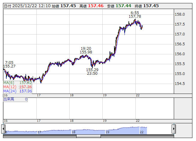 米ドル/円 <5分足> 「株探」多機能チャートより22日午前の東京市場でドル・円は軟調地合いとなり、157円70銭から157円28銭まで値を下げた。日銀の次の利上げ時期が不透明で、円売り地合いに変わりはない。ただ、日本政府の円安牽制で円買いが強まり、ドルやユーロなど主要通貨は対円で下落。