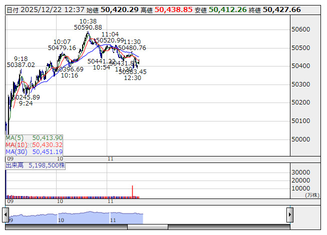 米株市場を横目に、22日の日経平均は前営業日比577.34円高の50084.55円と大幅続伸でスタート。心理的節目の5万円を回復した。その後もじりじりと上げ幅を広げて一時50590円をつけ、高値圏で推移して前場の取引を終了した。日銀の金融政策決定会合を通過した他、米国でのハイテク株高の流れもあり東京市場でも値がさハイテク株の上昇が指数を押し上げた。