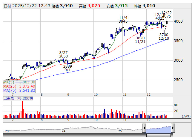 大有機 <日足> 「株探」多機能チャートよりArFレジスト向けを中心に半導体材料が好調に推移し、電子材料関連の販売が伸長したことが要因。また、経済産業省へ交付申請した「サプライチェーン対策のための国内投資促進事業費補助金」に関する補助金収入31億4000万円を特別利益として計上することも寄与する。なお、業績の上振れに伴い、期末配当予想を34円から39円へ引き上げており、年間配当は74円(前の期実績66円)となる。
