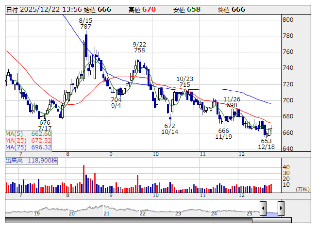 ファイバーG <日足> 「株探」多機能チャートより2021年2,500円を上回る株価から、足もとで665円まで調整しているファイバーゲート<9450>の株価は、反転上昇の時期を迎えつつある。配当利回りも4%となっており、高いインカムゲインを得ながら、その時期を待つことができる。再成長が時価総額に反映されれば、現状137億円の時価総額は300~450億円程度まで上昇する可能性もある。