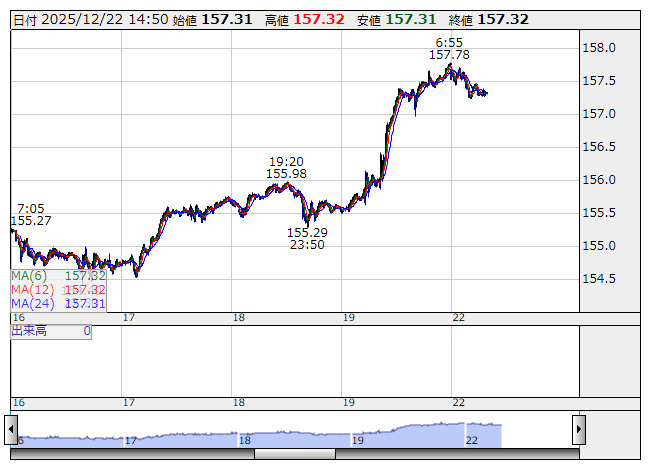 ここまでの取引レンジは、ドル・円は157円28銭から157円70銭、ユ-ロ・円は184円24銭から184円75銭、ユ-ロ・ドルは1.1706ドルから1.1722ドル。