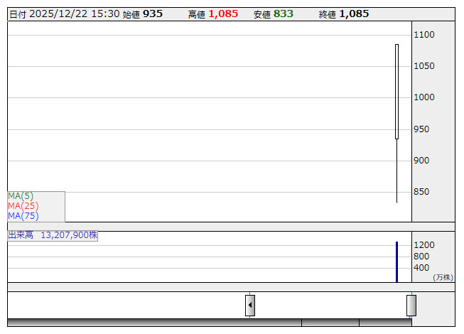 2025年12月22日15時38分 【材料】きょうのIPOの終値、スタートLはS高の1085円に上昇 スタートL <日足> 「株探」多機能チャートより きょう東証グロース市場に新規上場したスタートライン<477A>は、午後1時2分に公開価格480円を455円(94.8%)上回る935円で初値をつけた。初値形成後も順調に買いを集め午後2時52分にはストップ高の1085円に上昇。その後も買いを集めてストップ高で取引を終えた。 出所:MINKABU PRESS