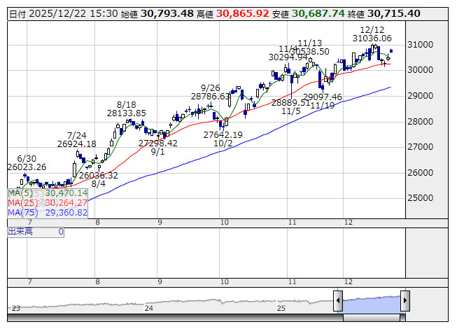 2025年12月22日15時47分 【市況】JPX日経400先物:22日清算値=180ポイント高、3万740ポイント JPX日経400 <日足> 「株探」多機能チャートより 22日15時45分、JPX日経インデックス400先物期近2026年3月限は前週末清算値比180ポイント高の3万740ポイントで取引を終えた。出来高は2451枚だった。この日のJPX日経インデックス400の現物終値3万715.4ポイントに対しては24.60ポイント高。 株探ニュース