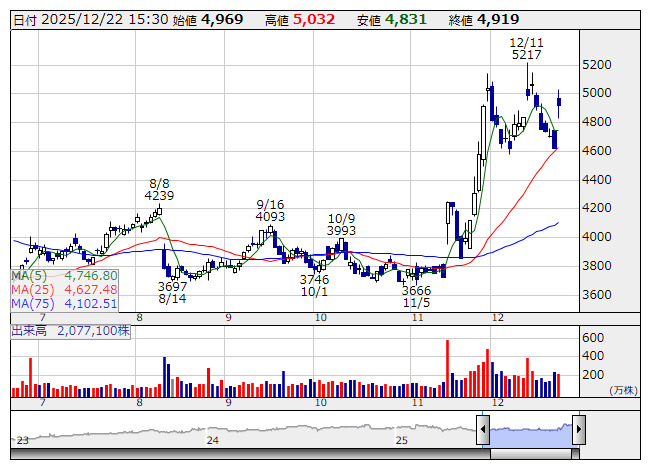 大幅続伸。米国ではマイクロンの決算発表後にAI関連銘柄への過熱警戒感が和らぎを見せつつあり、先週末も、エヌビディア製のAI半導体「H200」について、トランプ米政権が対中輸出に向けた審査を始めたと伝わり、エヌビディアなど半導体関連株の上昇につながった。米IT関連株には今後のクリスマスラリーへの期待も高まる方向のようだ。米国関連株高を受け、国内でも同社などのAIや半導体関連株が大きく値を上げた。
