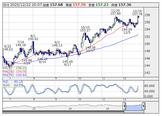 米ドル/円 <日足> Slowストキャス 「株探」多機能チャートより欧州市場でドル・円は失速し、157円34銭まで値を下げた。欧州株式市場で主要指数はマイナスに転じ、株安を嫌気した円買いに振れやすい。ただ、米株式先物は堅調を維持し、円買いは限定的。一方、米10年債利回りは下げ渋り、ドルは売りづらい。
