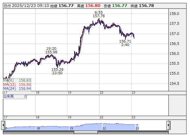 米ドル/円 <5分足> 「株探」多機能チャートより23日午前の東京市場でドル・円は弱含み、157円04銭から156円80銭までやや値を下げた。米10年債利回りの小幅低下でややドル売りに振れ、ユーロ・ドルは小高く推移する。ただ、日経平均株価は軟調スタートもプラスに転じ、円買いは後退した。