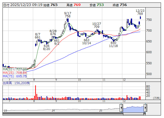 2025年12月23日09時19分 【材料】共和電が3日続伸、120万株を上限とする自社株買いを実施へ 共和電 <日足> 「株探」多機能チャートより 共和電業<6853>が3日続伸し年初来高値を更新している。22日の取引終了後に、自社株買いを実施すると発表したことが好感されている。上限を120万株(自己株式を除く発行済み株数の4.71%)、または8億円としており、取得期間は26年1月5日から12月18日まで。中長期的な企業価値向上を目指し、更なる株主還元の充実及び資本効率の向上を目的としており、取得した自社株は消却を予定している。 出所:MINKABU PRESS