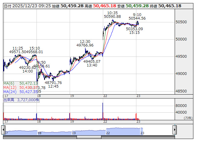 23日の日経平均は27.91円安の50374.48円と3日ぶり反落して取引を開始した。前日22日の米国株式市場は続伸。ダウ平均は227.79ドル高の48362.68ドル、ナスダックは121.21ポイント高の23428.83で取引を終了した。追加利下げを期待した買いが続き、寄り付き後、上昇。半導体エヌビディア(NVDA)の回復がけん引し相場は続伸した。クリスマスラリー期待を受けた買いも目立ち、終日堅調に推移し、終盤にかけ上げ幅を拡大した。