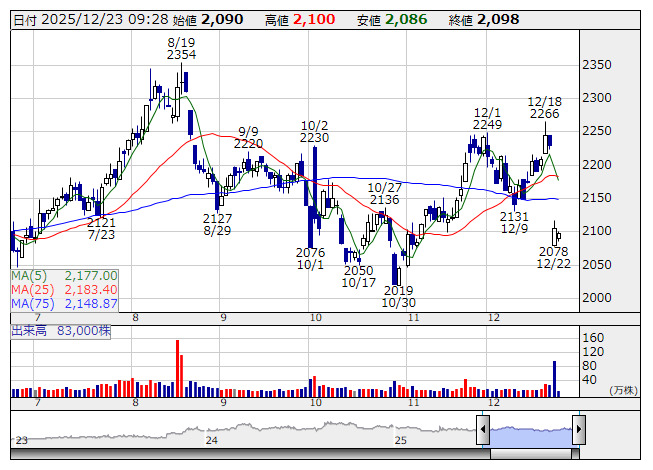 2025年12月23日09時28分 【材料】西松屋チェが冴えない、12月度既存店売上高が2カ月ぶり前年下回る 西松屋チェ <日足> 「株探」多機能チャートより 西松屋チェーン<7545>が冴えない動き。22日の取引終了後に発表した12月度(11月21日~12月20日)の月次売上高速報で、既存店売上高が前年同月比3.3%減と2カ月ぶりに前年実績を下回ったことが嫌気されている。 育児・服飾雑貨の売上高は好調に推移した一方、冬物衣料の売上高が前年を下回った。なお、全店売上高は同1.3%増だった。 出所:MINKABU PRESS