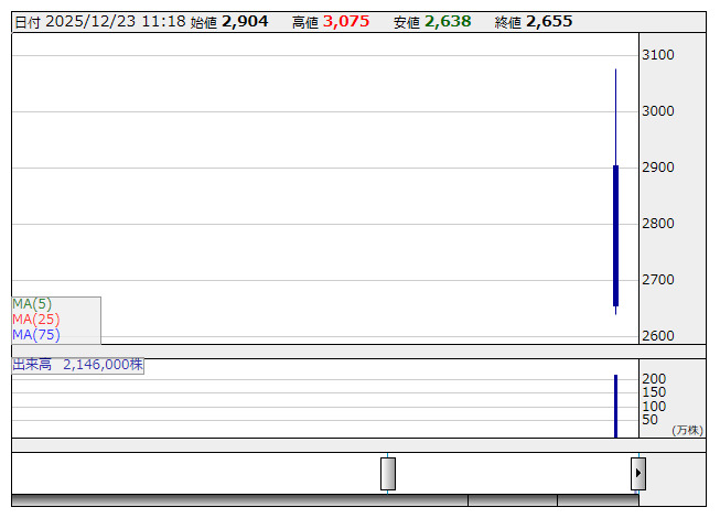 2025年12月23日11時19分 【材料】テラテクノロジー---本日新規上場、公開価格38.9%上回る初値示現 テラテクノ <日足> 「株探」多機能チャートより テラテクノロジー<483A>は本日スタンダード市場に新規上場、公開価格2090円を38.9%上回る初値2904円をつけ、その後も堅調な動きとなっている。スタンダード案件ではあるが、公開規模は13.7億円と低水準であり、需給懸念の乏しさが妙味となっているもよう。先にスタンダード市場へ上場した辻・本郷ITが初値6割高となっていたことからも、短期志向の投資資金が向かいやすくなったようだ。 《HM》 提供:フィスコ
