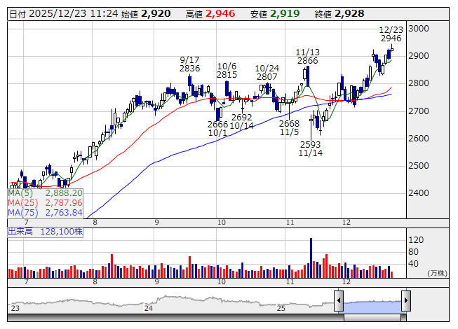 UT <日足> 「株探」多機能チャートよりUTグループ<2146>の株主還元が注目される。11月13日に第5次中期経営計画を見直し、2029年3月期までは配当性向100%、一株当たり配当金10円(2026 年1月1日を効力発生日とした1:15の株式分割考慮後)の下限確約を設定した。5.3%の配当利回りが明示され、利益の状況次第では上乗せされる。モーター・エナジー事業での想定を下回る需要、採用単価の上昇など期初の計画は下回ったものの、同社の利益創出力は高い。中計最終年度のPER15倍は、時価総額1,350億円となる(現在1,114億円)。株価は下値が堅く、かつ高いインカムゲインを享受しながら、アップサイドを狙えるということになろう。