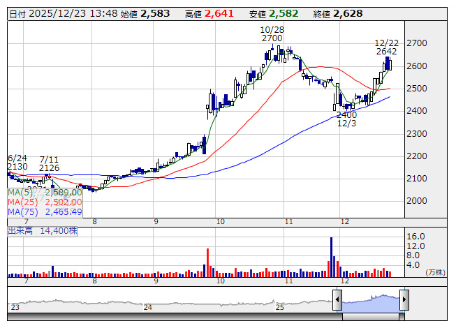 ニイタカ <日足> 「株探」多機能チャートより12月24日の決算発表銘柄(予定)