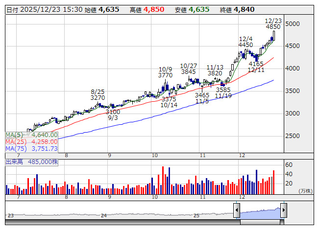 大幅続伸。発行済み株式数の4.7%に当たる120万株、8億円を上限とする自己株式の取得実施を発表している。取得期間は26年1月5日から12月18日まで。取得予定の株式は消却を予定しているもよう。中長期的な企業価値向上を目指し、株主還元の充実および資本効率の向上を目的としている。自社株買いは、9月にかけて10億円上限の自社株買いを行って以来。目先の需給改善を期待する動きが先行。